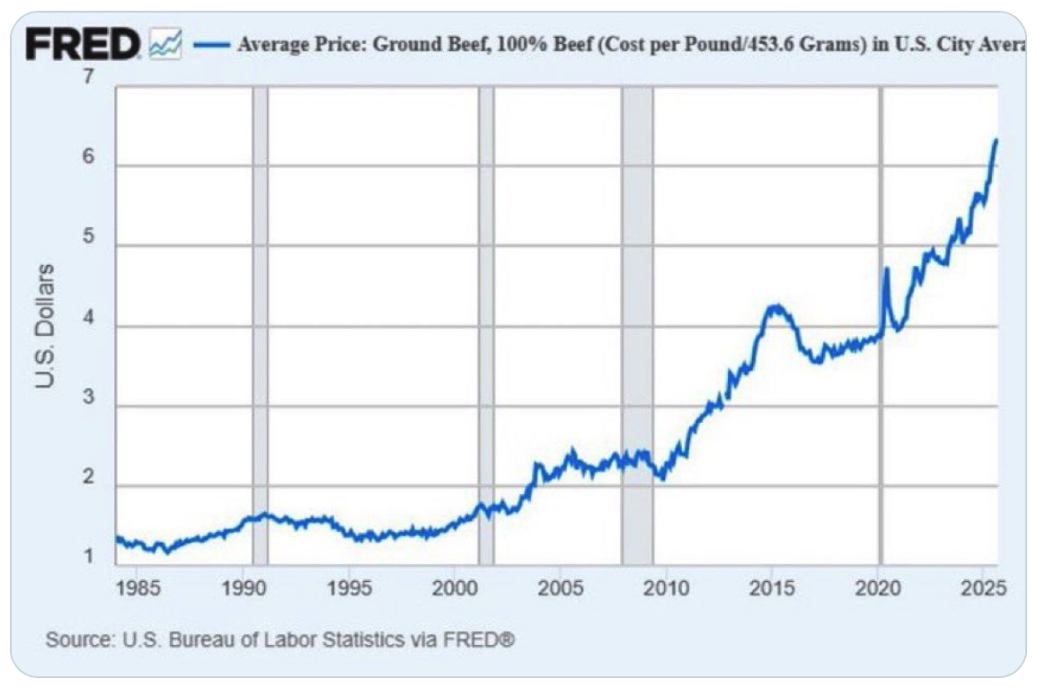 Just look at what is happening to the price of ground beef. It now costs about three times as much as it did just 15 years ago…