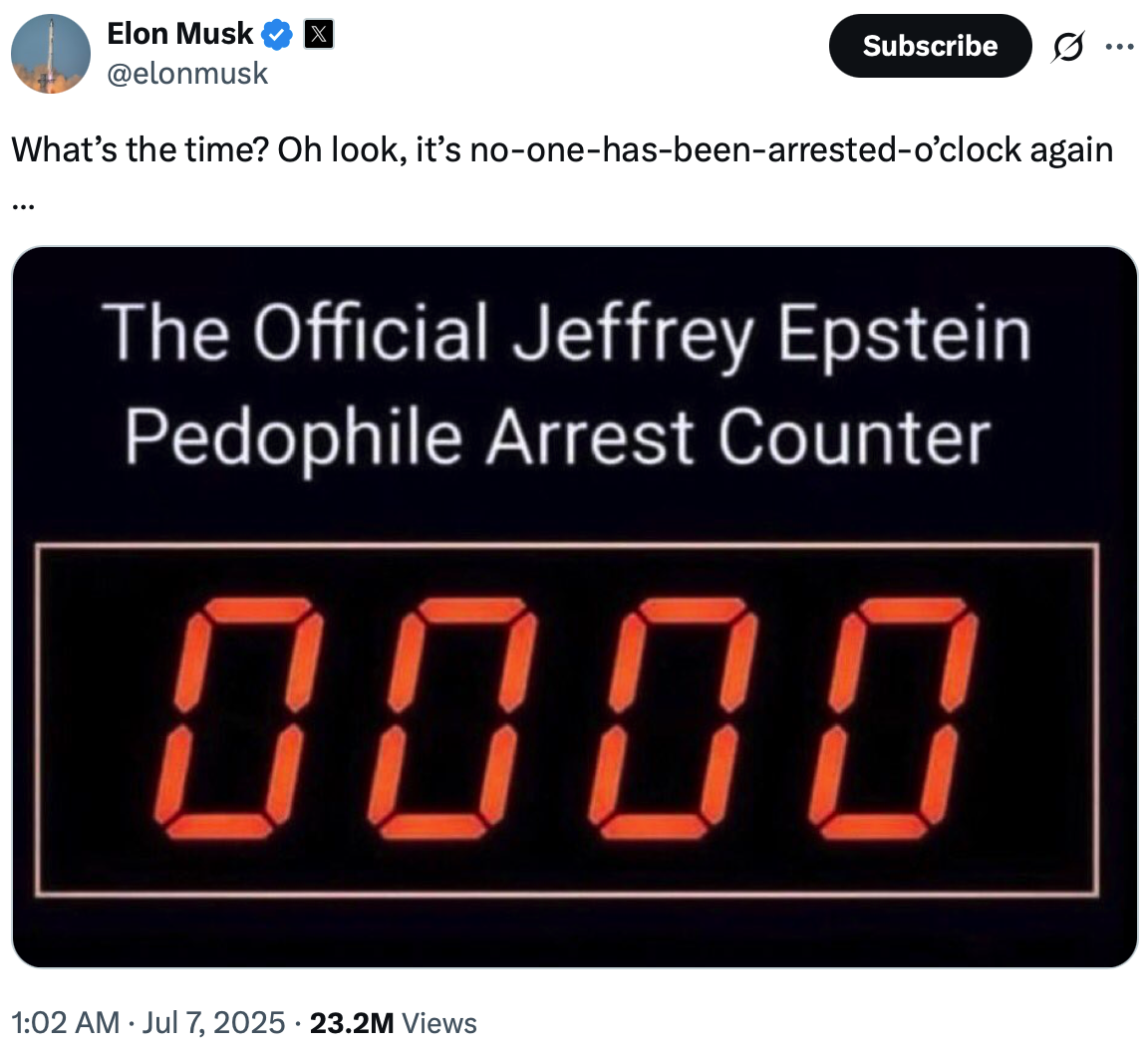#11 During the time that Elon Musk had unprecedented access to the government’s computer systems, did he learn some startling truths about the Epstein investigation? If so, will he reveal what he knows now that he has started his own political party?