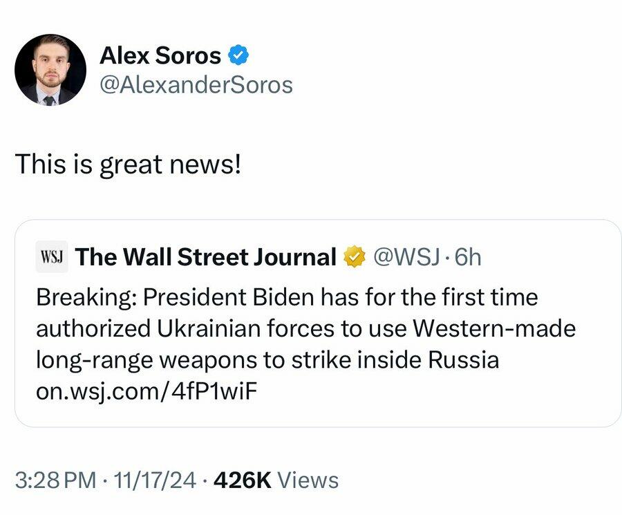 When he heard that Ukraine had been given the green light to launch long-range missiles into Russia, Alex Soros was absolutely thrilled…